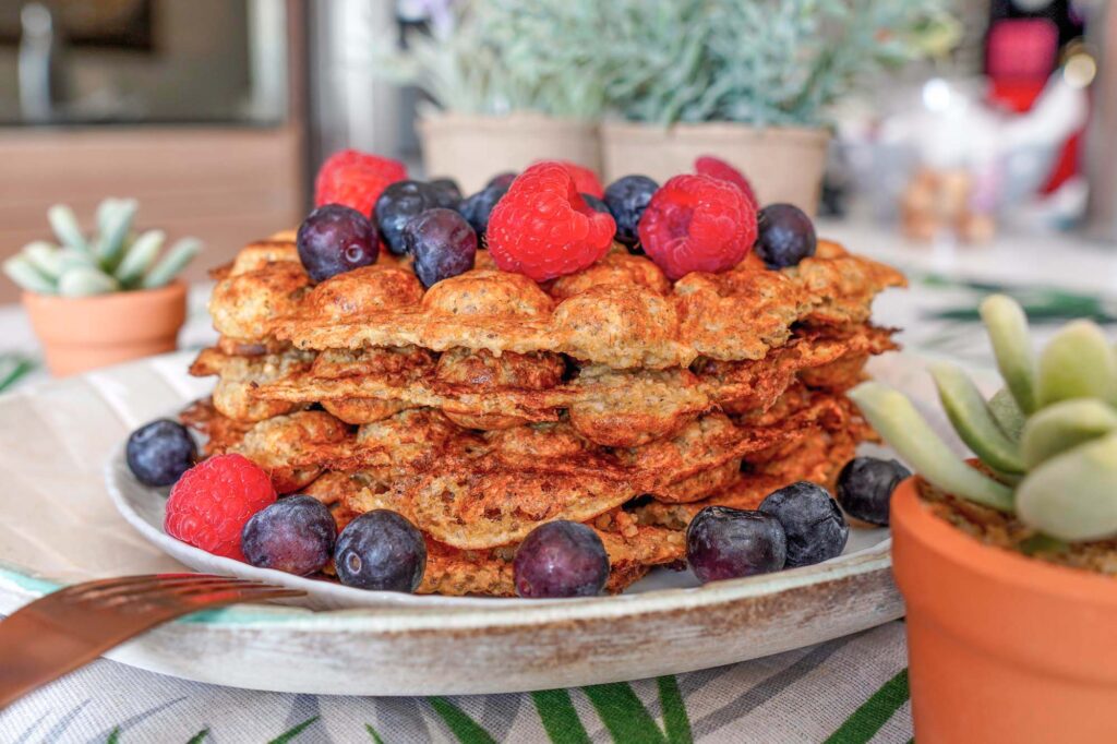 Ζεσταίνω τη μηχανή για βάφλες και λαδώνω με λάδι καρύδας χρησιμοποιώντας πινελάκι σιλικόνης. (Και ελαιόλαδο λειτουργεί εξαιρετικά). |
