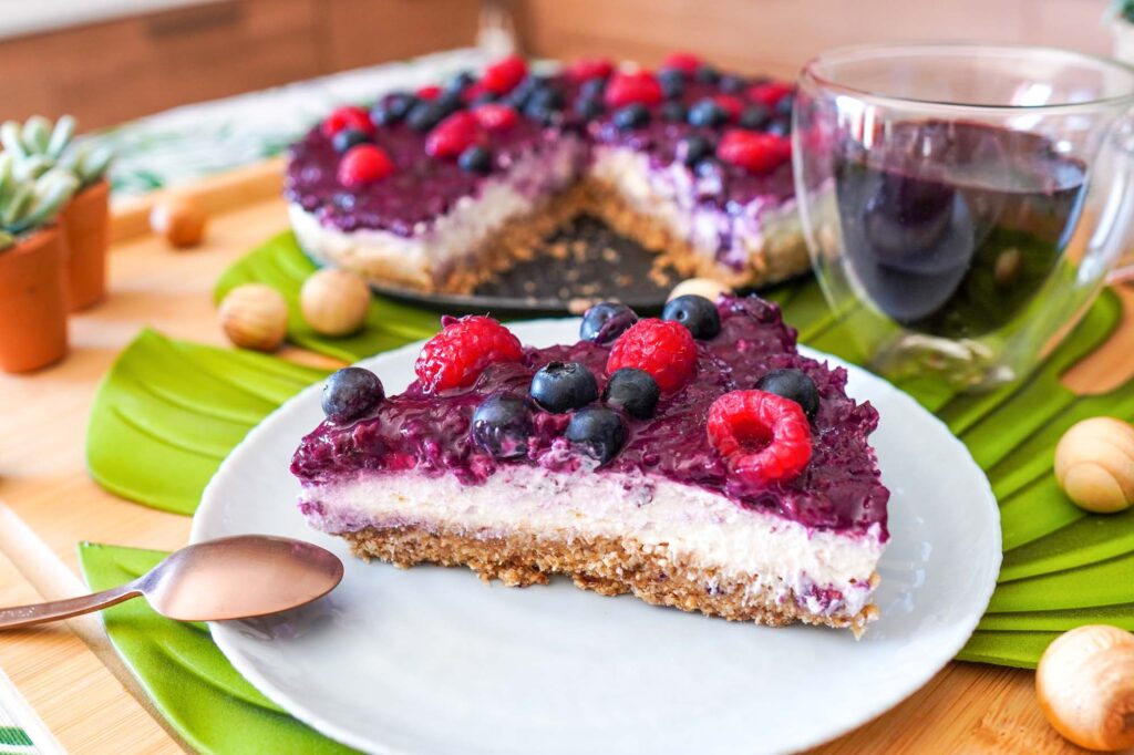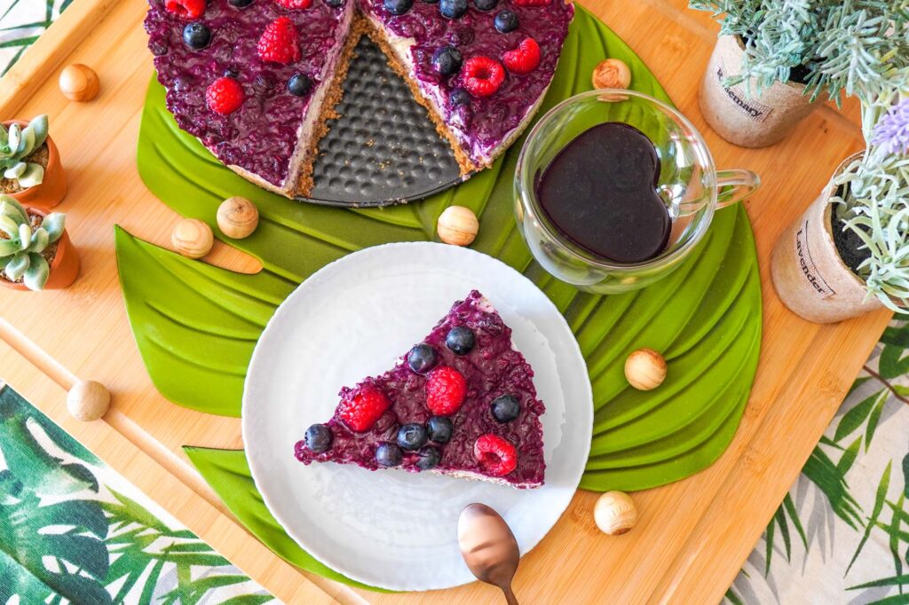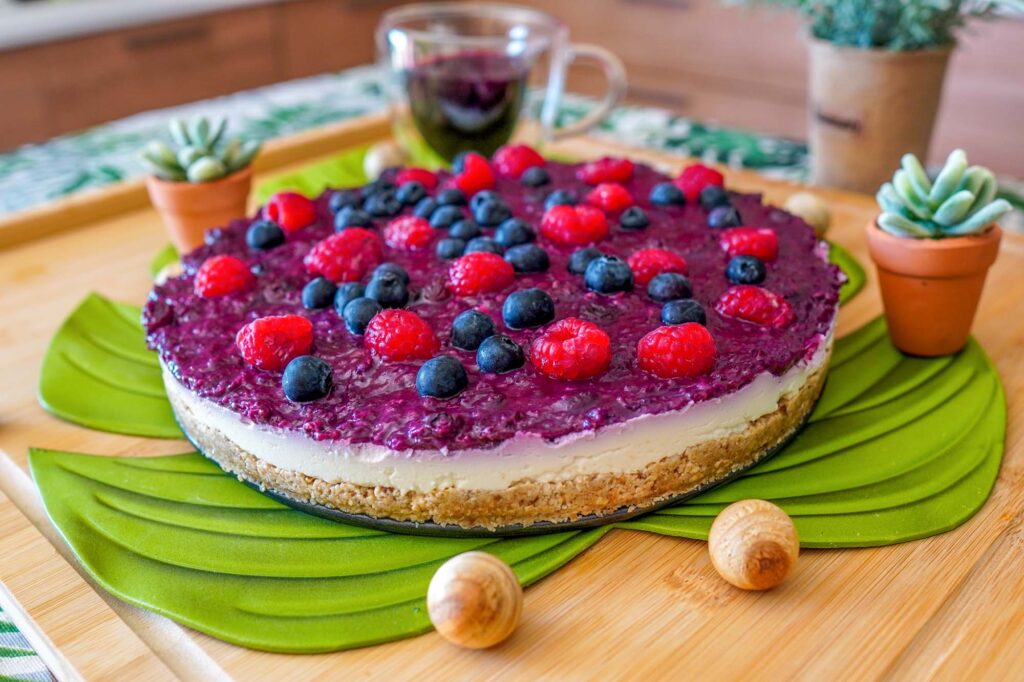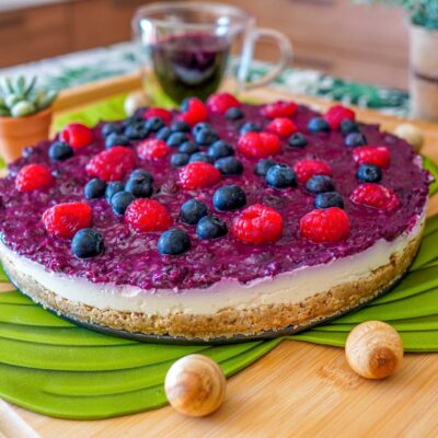 Τέλος τοποθέτω το topping πάνω από την κρέμα στο τσέρκι και διακοσμώ με φρέσκα μούρα.