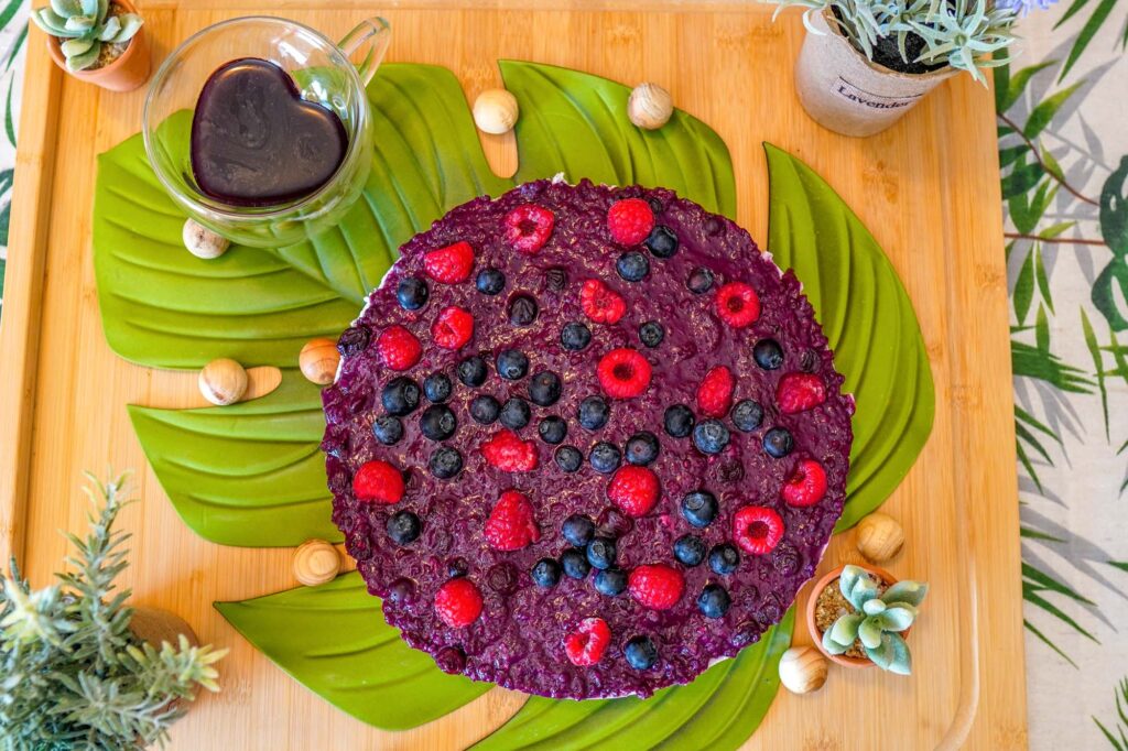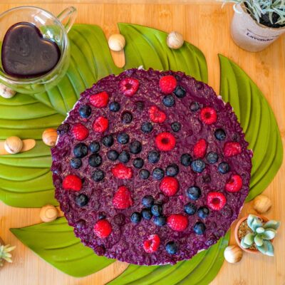 Αποφάσισα να κάνω το topping κάτι σαν porridge, γι’ αυτό και πρόσθεσα νιφάδες βρώμης (αυτό βοήθησε και στην υφή, έγινε πιο πηχτό και στεκόταν σαν πηχτή μαρμελάδα).